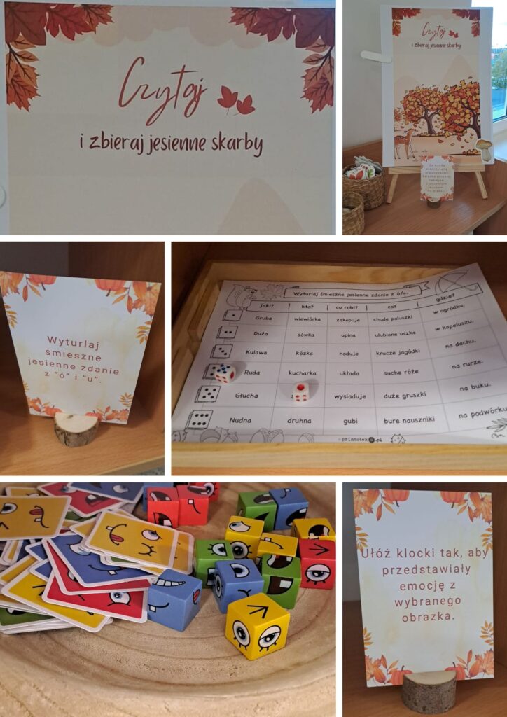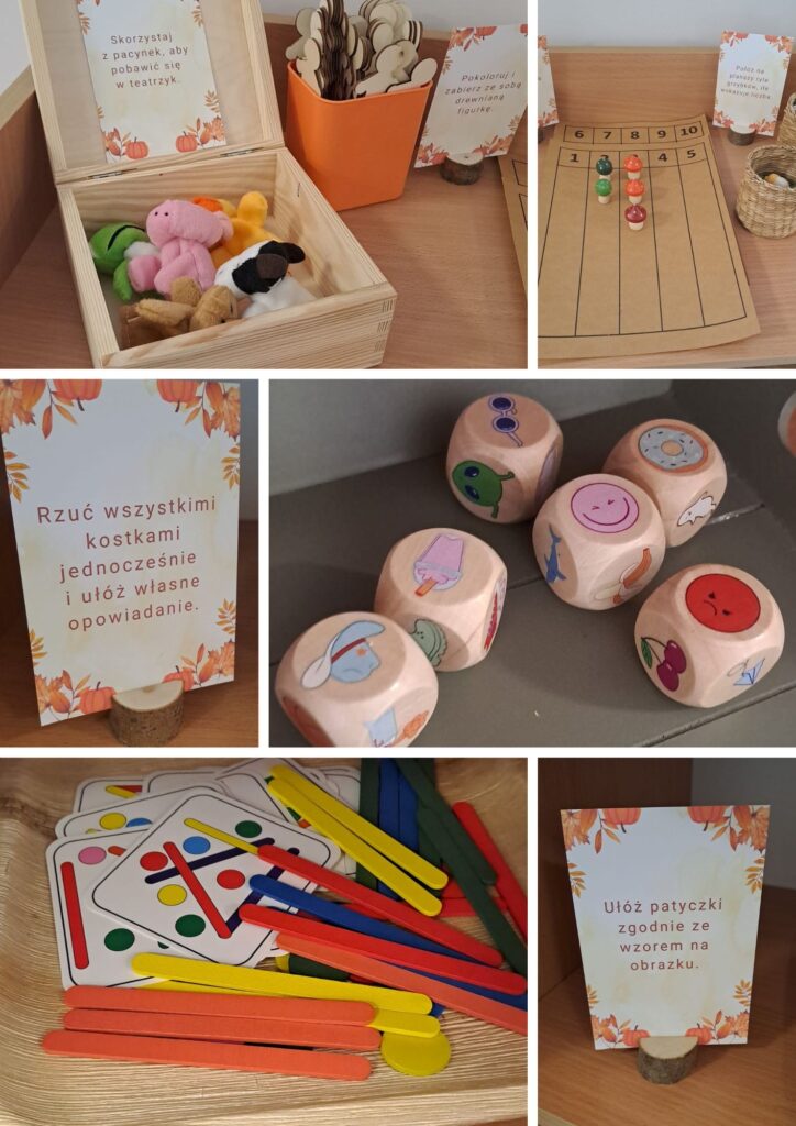 Dodatkowo, zapraszamy dzieci do udziału w rozwijających zabawach, takich jak: zabawy z pacynkami, które wspierają rozwój wyobraźni i kompetencji językowych, tworzenie opowiadań z wykorzystaniem kostek z obrazkami, układanie kolorowych grzybków na planszy wspomagających naukę liczenia w zakresie 10, układanie patyczków według wzoru, które rozwijają percepcję wzrokową i motorykę małą, rozpoznawanie emocji poprzez układanie klocków z rysunkami emocji i inne.